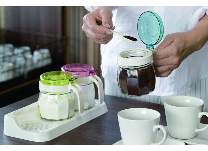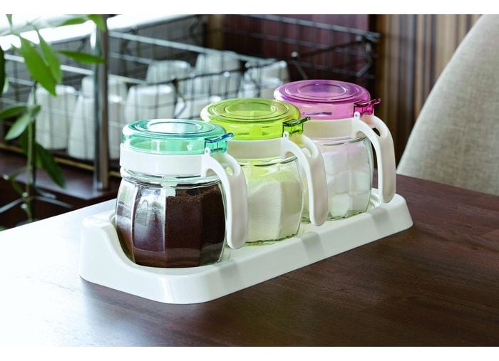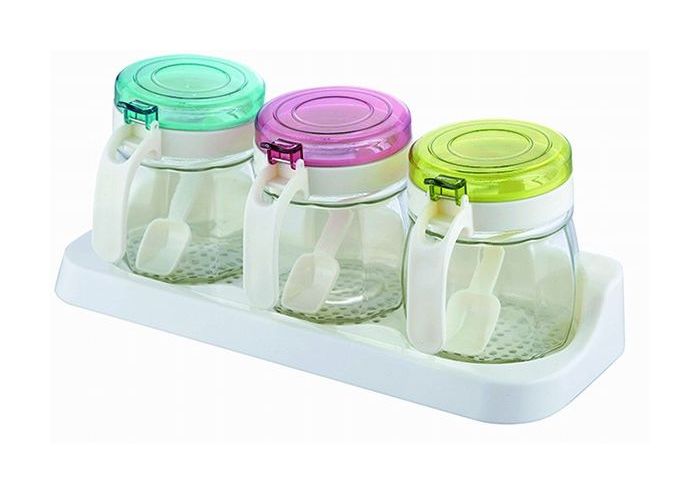 かわいいデザインなので、ホームパーティでのトッピング容器やコーヒータイムのお菓子入れなどにも様々利用できます。台座付きなので,3個一緒に持ち運べます。蓋の部分が3色に分れている為、中身を分けても判別できます。