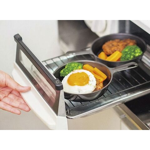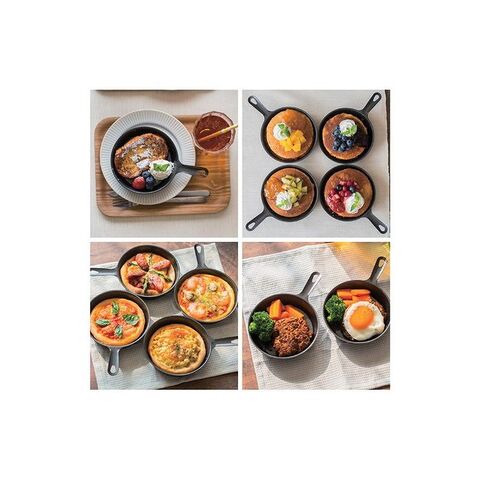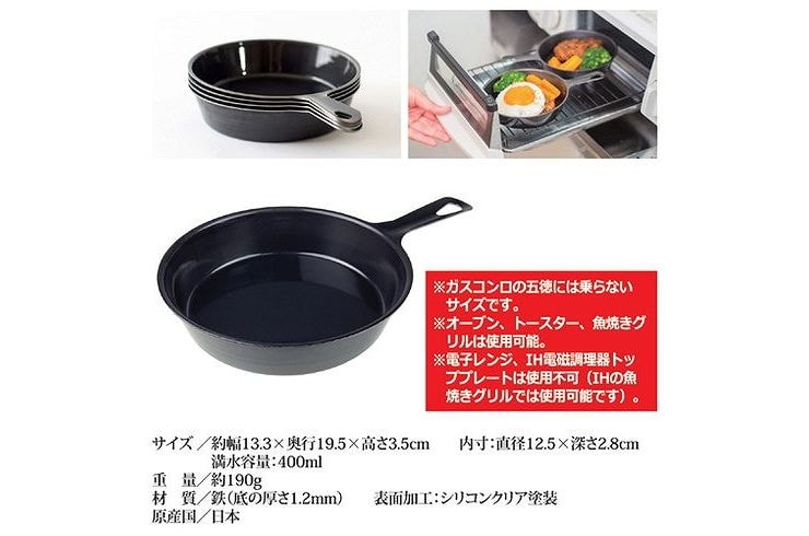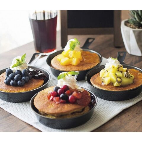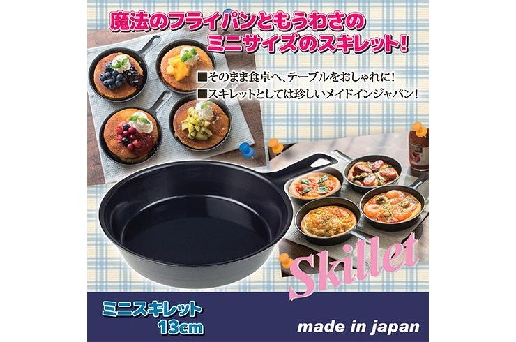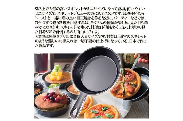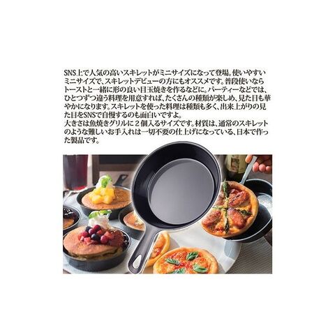 SNS上で人気の高いスキレットがミニサイズになって登場。使いやすいミニサイズで、スキレットデビューの方にもオススメです。普段使いならトーストと一緒に形の良い目玉焼きを作るなどに。パーティーなどでは、ひとつずつ違う料理を用意すれば、たくさんの種類が楽しめ、見た目も華やかになります。スキレットを使った料理は種類も多く、出来上がりの見た目をSNSで自慢するのも面白いですよ。大きさは魚焼きグリルに2個入るサイズです。材質は、通常のスキレットのような難しいお手入れは一切不要の仕上げになっている、日本で作った製品です。