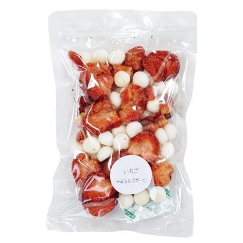新鮮ないちごを特殊フライ製法でドライ加工した「いちごチップス」と、やさしい甘さの「ヤギミルクボーロ」を詰め合わせました。