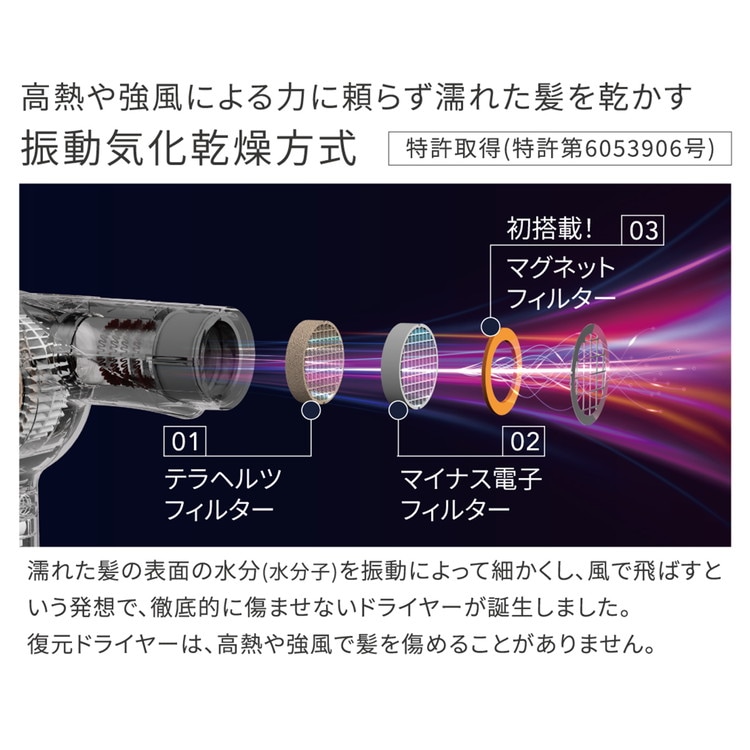 「適温・適湿・適風・マイナス電子・テラヘルツ・マグネット」に着目した復元ドライヤーは、それまで髪を乾かすだけだった従来のドライヤーの常識を大きく変えました。