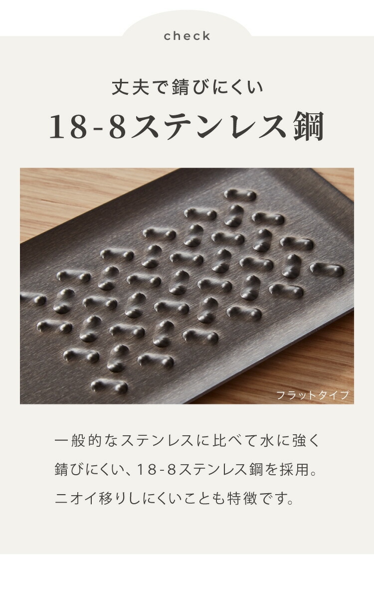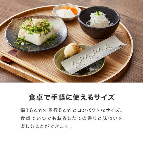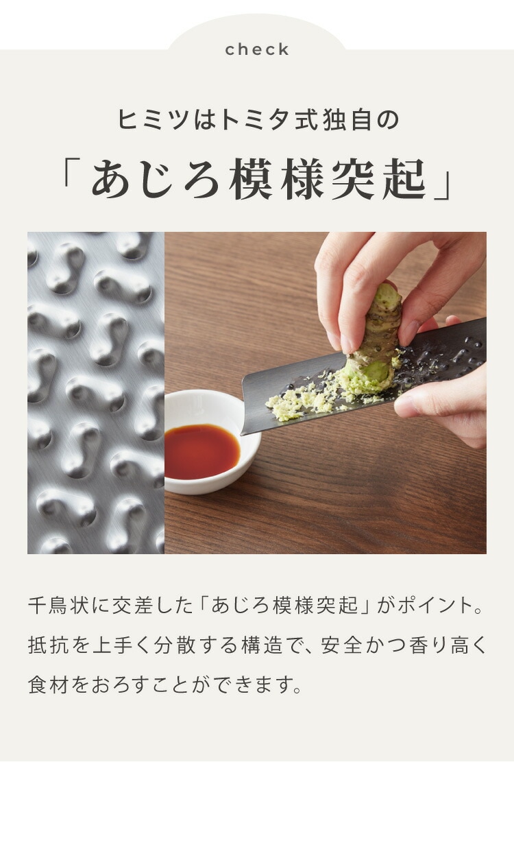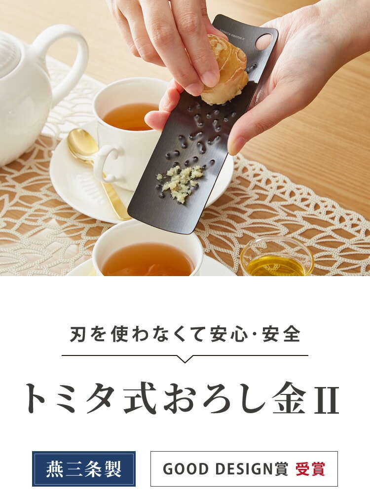 50年以上の歴史を持つ金属加工会社トミタが作る、刃を使わない「トミタ式おろし金」。刃がないからすりおろしのときに手を切らず安心、安全。にんにくなど小さな食材も最後まで擦り切れて、目詰まりをとるスクレーパーも必要ありません。洗う時のスポンジも引っかからずお手入れ簡単