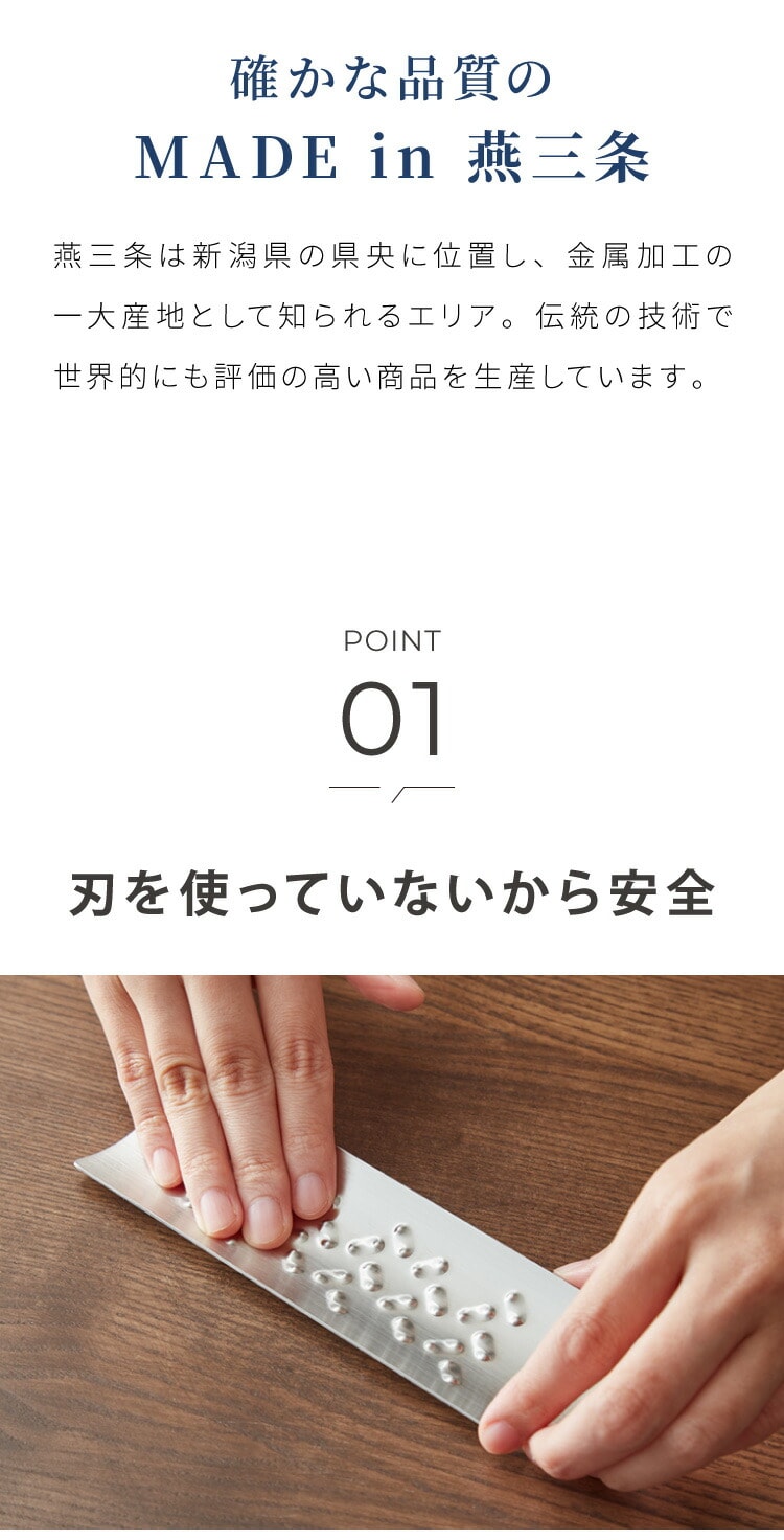 燕三条発!刃を使わないおろし金はすりおろしのときに手を切らず安心、安全。にんにくなど小さな食材も最後まで擦り切れる!洗う時のスポンジも引っかからずお手入れ簡単♪