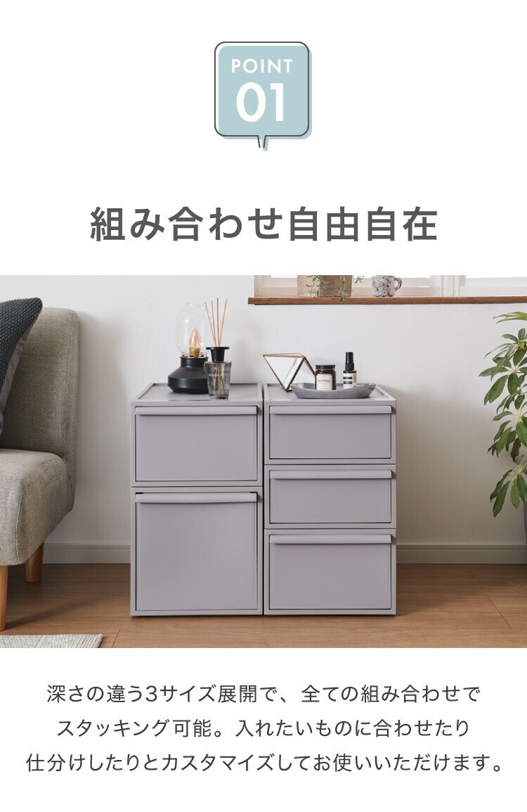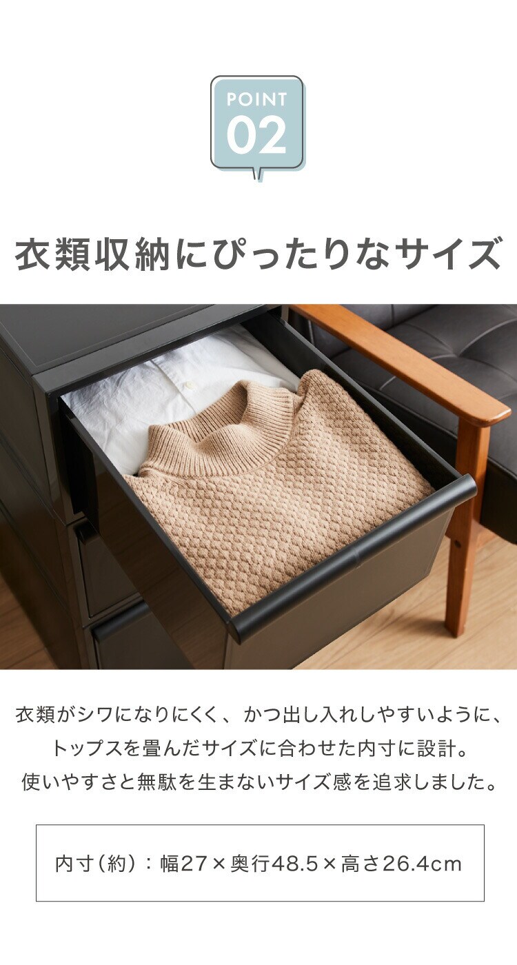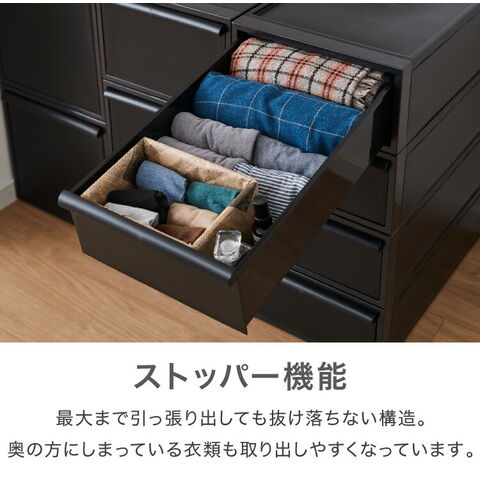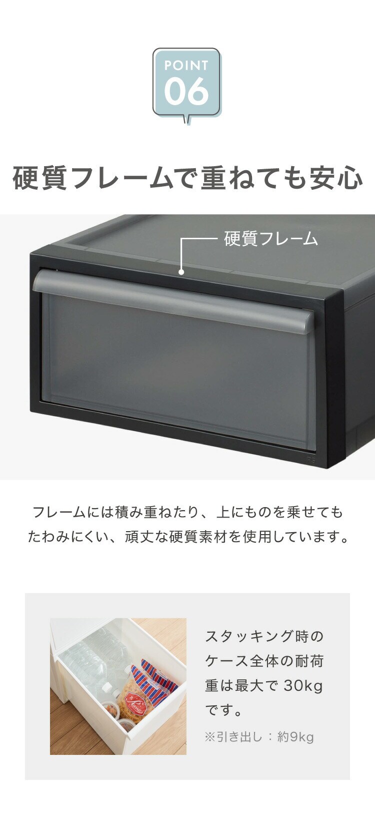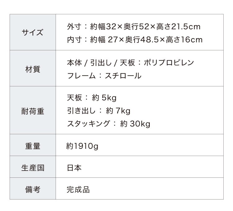 耐荷重:天板/5kg 引出し/9kg スタッキング/最大約30kg