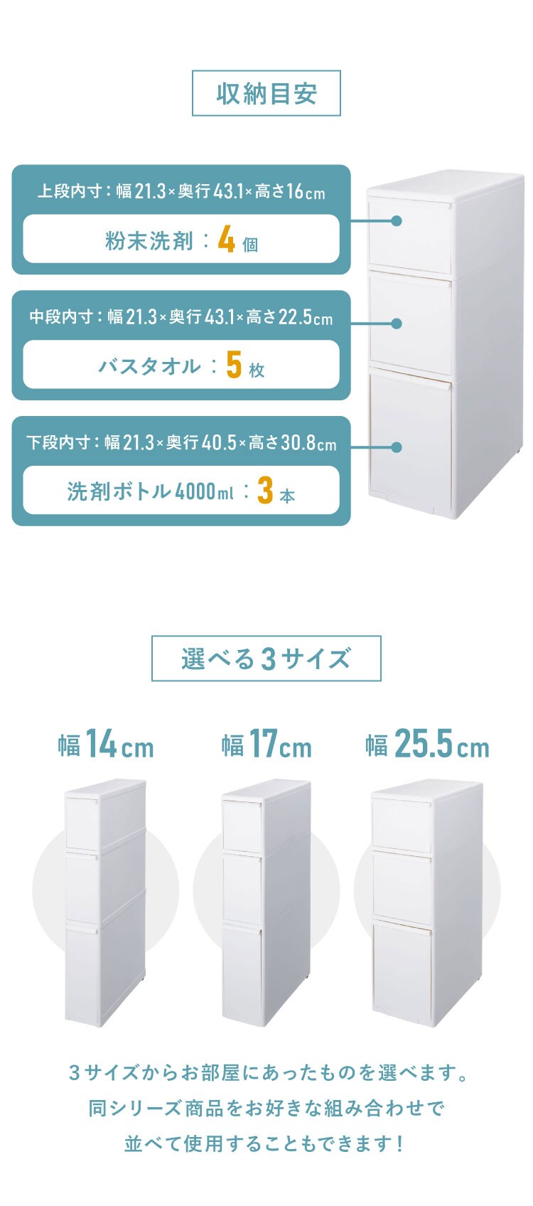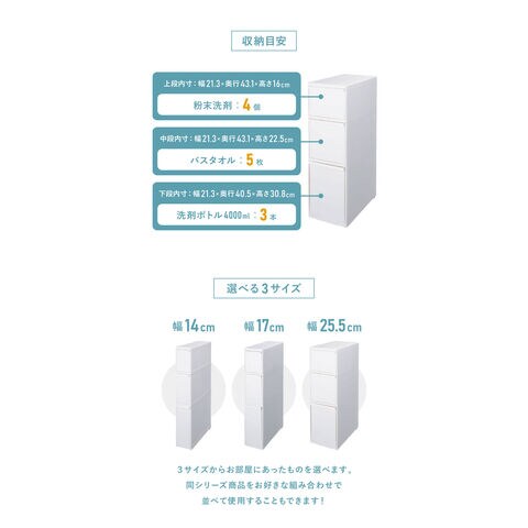 引き出し内寸:上段幅21.3×高さ16×奥行43.1cm、中段幅21.3×高さ22.5×奥行43.1cm、下段幅21.3×高さ30.8×奥行40.5cm