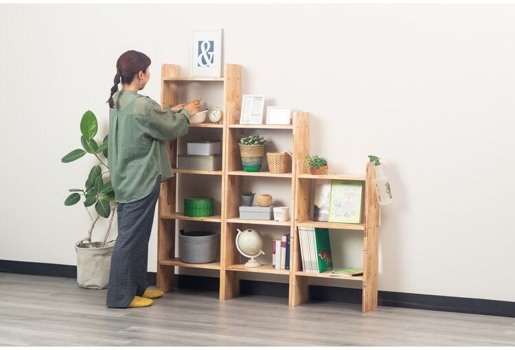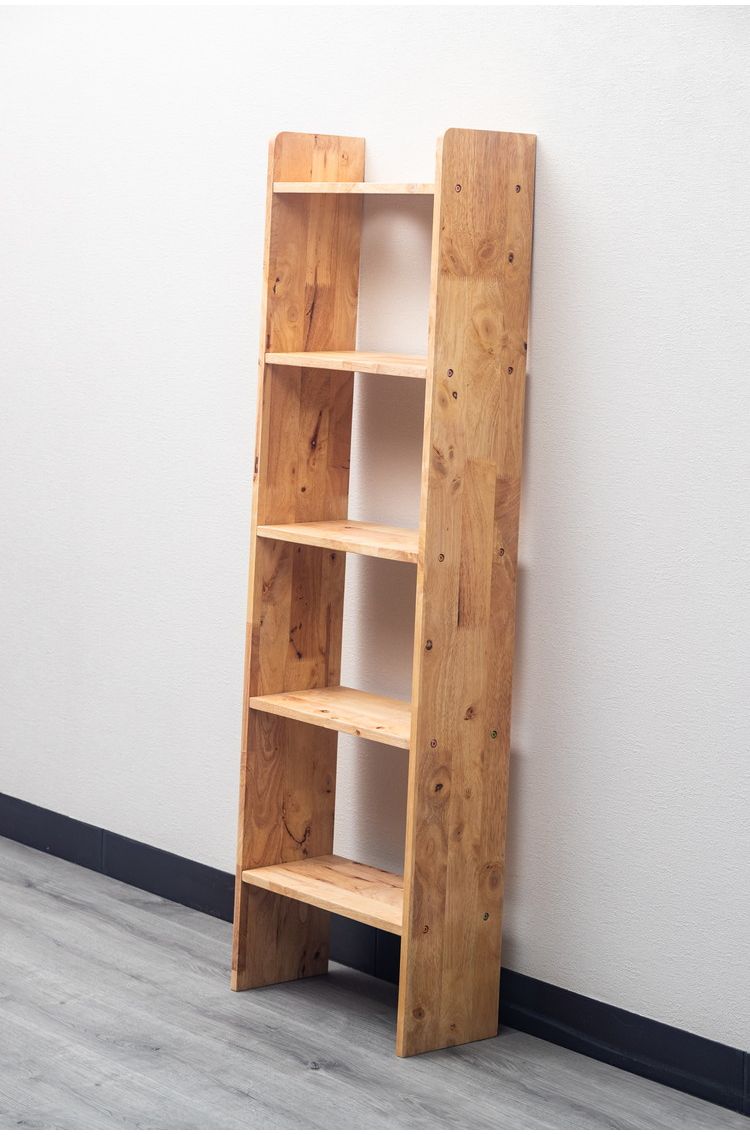 壁立て掛け式のラックです。転倒防止パーツなどは付属いたしません。/木目には個体差が生じます。黒い節・黒い斑点模様が出ることがあります/節や木の欠けた部分をパテ埋めしてある場合がございます。これにより天板の一部が凸凹する可能性があります/これらは全て個体差の範疇となり、返品・交換は一切承ることができません。
