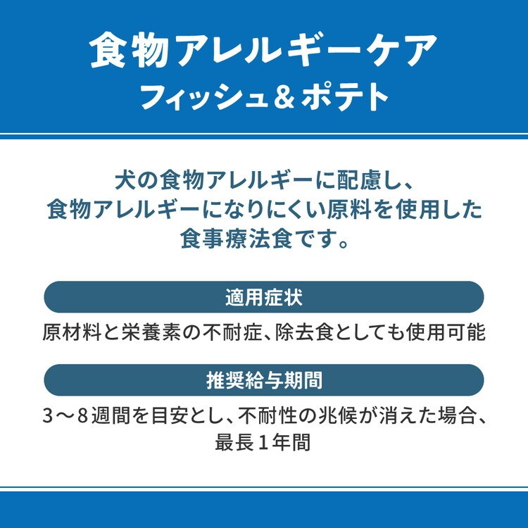 「VetsWell 食物アレルギーケア フィッシュ&ポテト」は犬の食物アレルギーに配慮し、特別に調製された食事療法食です。この食事は、食物アレルギーの原因となりにくい、新奇性の動物タンパク源として白身魚(プタスダラ*1)を使用し、高い消化性*2により消化管の健康維持に配慮しています。また皮膚の健康維持のため、オメガ3系脂肪酸(EPA、DHA)を調整*3することで健康な皮膚をサポートします。