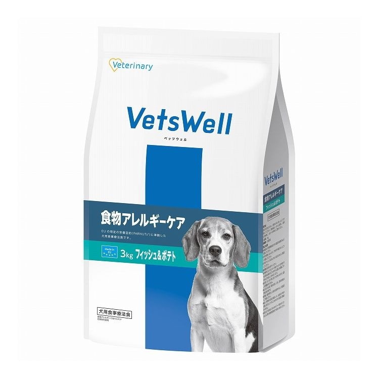 「VetsWell 食物アレルギーケア フィッシュ&ポテト」は犬の食物アレルギーに配慮し、特別に調製された食事療法食です。この食事は、食物アレルギーの原因となりにくい、新奇性の動物タンパク源として白身魚(プタスダラ*1)を使用し、高い消化性*2により消化管の健康維持に配慮しています。また皮膚の健康維持のため、オメガ3系脂肪酸(EPA、DHA)を調整*3することで健康な皮膚をサポートします。