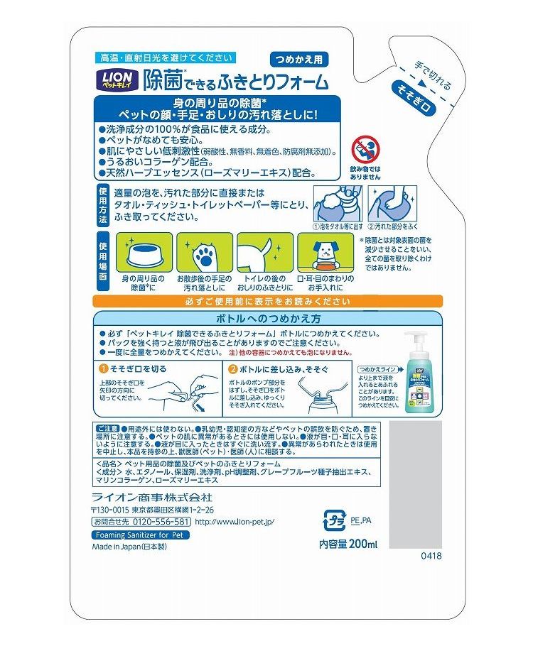 ・ペットキレイ除菌できる ふきとりフォームのつめかえ用泡をペットのボディに直接またはタオルやティッシュなどに取り、ふきとるだけ。