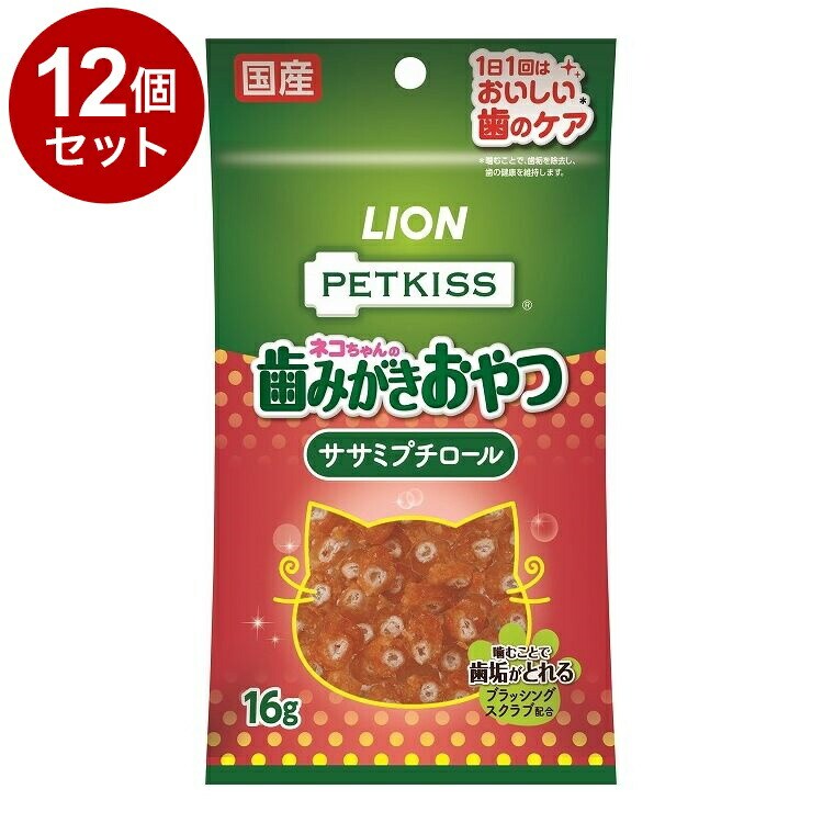 【12個セット】 ライオンペット PETKISS ネコちゃんの歯みがきおやつ ササミプチロール 16g【ポイント10倍】 【送料無料】