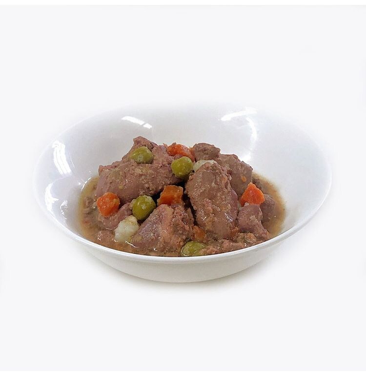 鶏内臓(鶏レバー他)、野菜類(じゃがいも、人参、グリンピース)、食塩、増粘安定剤(増粘多糖類)、発色剤(亜硝酸Na)