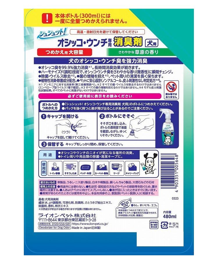【4個セット】 ライオンペット シュシュット!オシッコ・ウンチ専用 消臭剤 犬用 つめかえ用 大容量 480ml【ポイント10倍】 【送料無料】