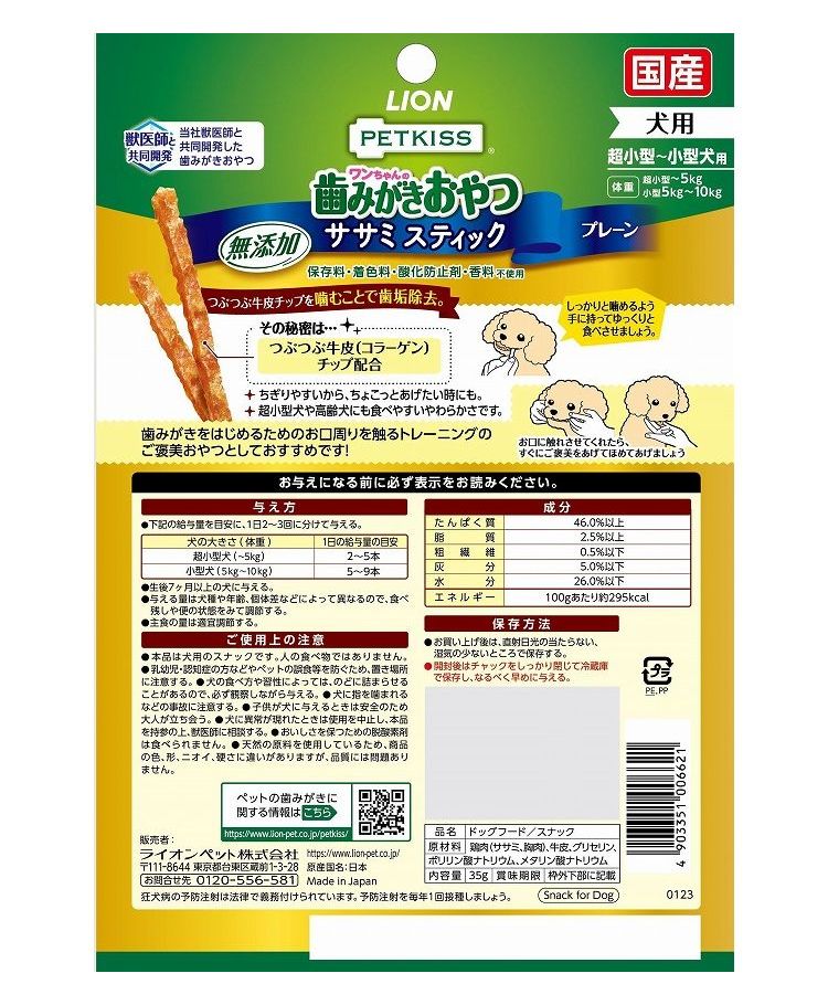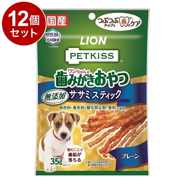 【12個セット】 ライオンペット PETKISS ワンちゃんの歯みがきおやつ 無添加ササミスティック プレーン 35g【ポイント10倍】 【送料無料】