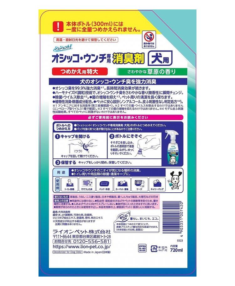 【6個セット】 ライオンペット シュシュット!オシッコ・ウンチ専用 消臭剤 犬用 つめかえ用 特大 720ml【ポイント10倍】 【送料無料】