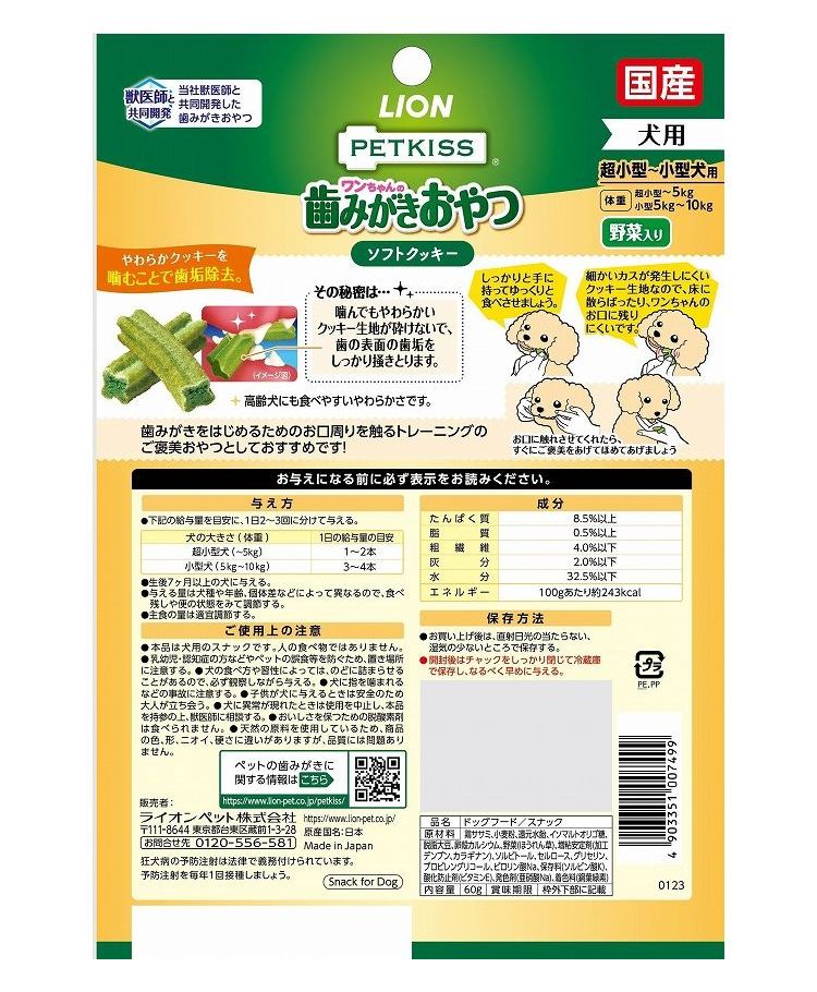 【8個セット】 ライオンペット PETKISS ワンちゃんの歯みがきおやつ ソフトクッキー 野菜入り 60g【ポイント10倍】 【送料無料】