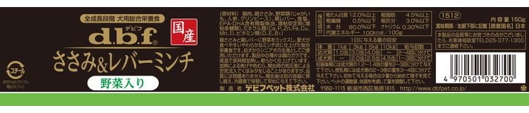 鶏肉、鶏ささみ、野菜類(じゃがいも、人参、グリンピース)、鶏レバー、食塩、EPA・DHA含油精製魚油、増粘安定剤(増粘多糖類)、ミネラル類(Ca、P、Zn、Fe、Cu、Mn、I)、ビタミン類(D、E、B1)