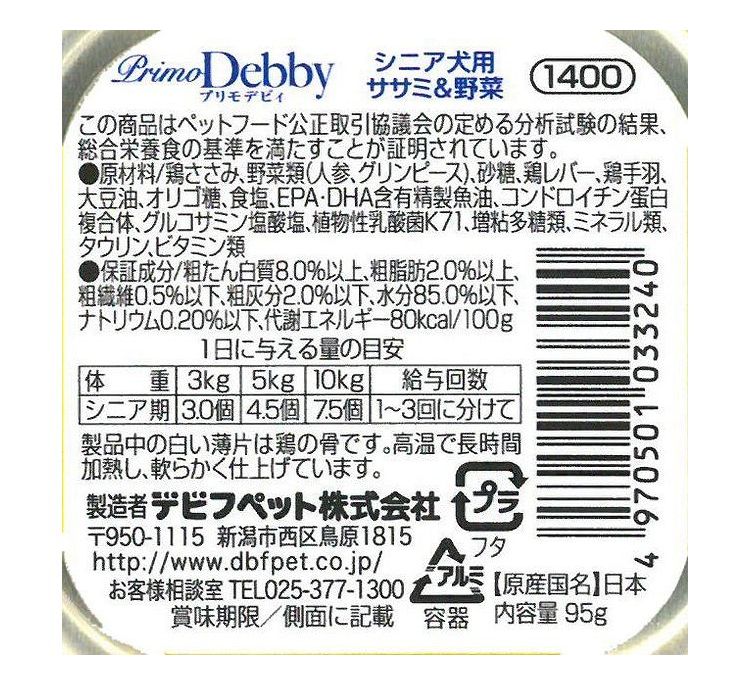 【6個セット】 デビフ プリモデビィ シニア犬用 ササミ野菜 95g 犬用 フード ドッグフード
