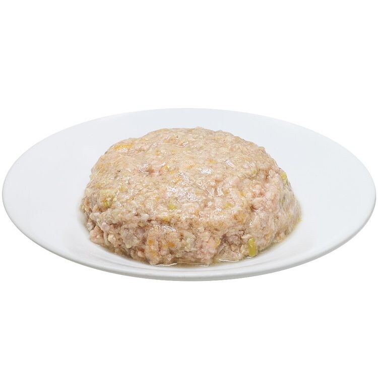 ・鶏胸肉、豚心臓、鶏レバーをベースに、すりおろした野菜(じゃがいも、人参、グリンピース)を加え、高齢犬にも食べやすいやわらかさに仕上げた総合栄養食です。