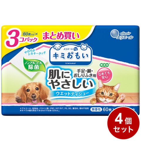【4個セット】 エリエールペット キミおもい ウエットティシュ― ノンアル 60×3 ペット用 ウェットティッシュ 犬用 猫用 ノンアルコール 除菌【ポイント10倍】 【送料無料】