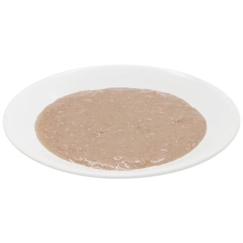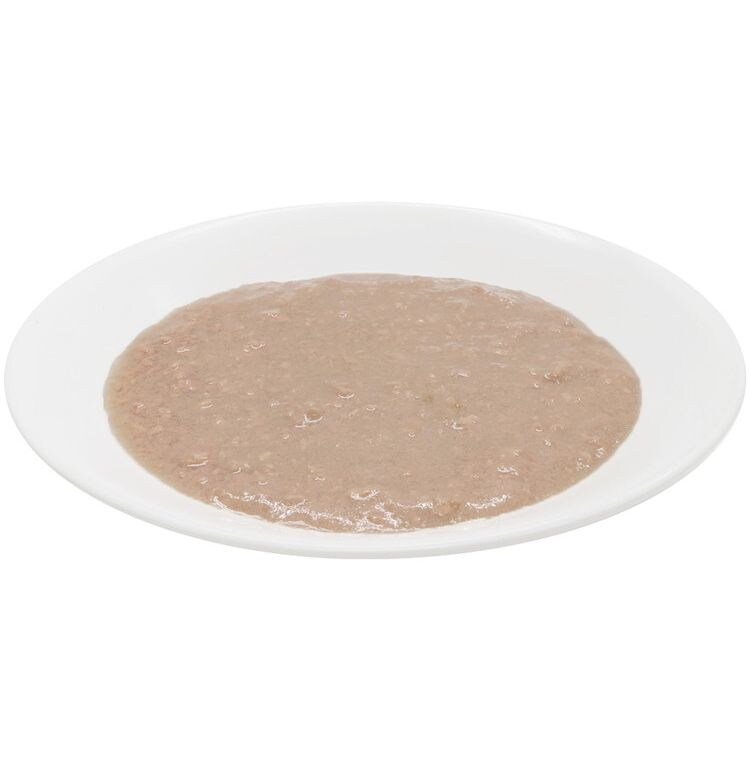 肉本来の味を感じられるようチキンをカットし、なめて食べられるとろみタイプに仕上げました。高齢期の健康に配慮して、グルコサミン・コンドロイチンを配合しています。