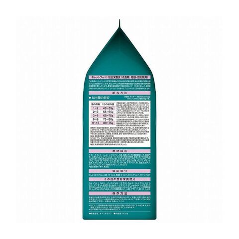 チキン、チキンミール、コーングルテン、小麦、鶏脂(オメガ6脂肪酸源)、米、脱脂大豆、小麦たんぱく、フィッシュミール、たんぱく加水分解物、魚油(オメガ3脂肪酸(DHA)源)、大麦、酵母(βグルカン源)、ミネラル類(カルシウム、リン、カリウム、ナトリウム、クロライド、マグネシウム、鉄、銅、マンガン、亜鉛、ヨウ素、セレン)、カラメル色素、ビタミン類(A、D、E、K、B1、B2、パントテン酸、ナイアシン、B6、葉酸、ビオチン、B12、コリン、C)、アミノ酸類(メチオニン、タウリン)