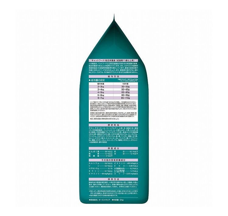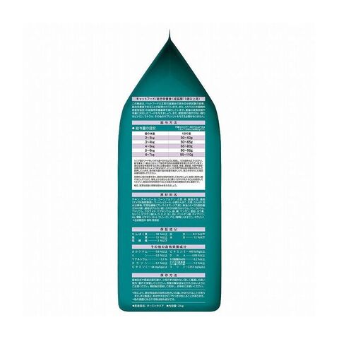 チキン、チキンミール、コーングルテン、小麦、米、脱脂大豆、鶏脂(オメガ6脂肪酸源)、フィッシュミール、小麦たんぱく、たんぱく加水分解物、可溶性繊維(プレバイオティクス源)、魚油(オメガ3脂肪酸(DHA)源)、酵母(βグルカン源)、ミネラル類(カルシウム、リン、カリウム、ナトリウム、クロライド、マグネシウム、鉄、銅、マンガン、亜鉛、ヨウ素、セレン)、ビタミン類(A、D、E、K、B1、B2、パントテン酸、ナイアシン、B6、葉酸、ビオチン、B12、コリン、C)、アミノ酸類(メチオニン、タウリン)