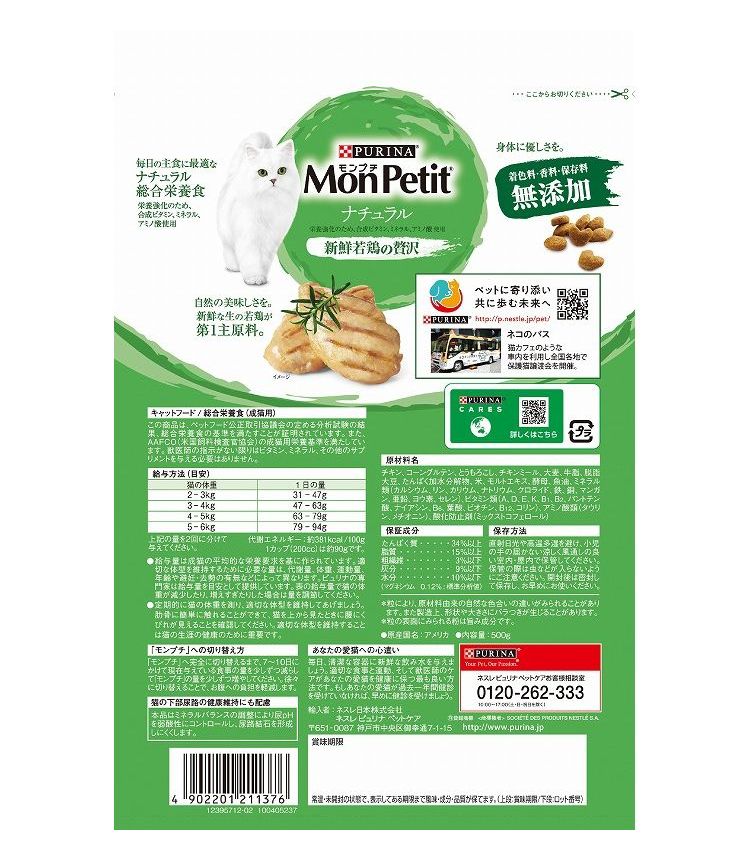 チキン、コーングルテン、とうもろこし、チキンミール、大麦、牛脂、脱脂大豆、たんぱく加水分解物、米、モルトエキス、酵母、魚油、ミネラル類(カルシウム、リン、カリウム、ナトリウム、クロライド、鉄、銅、マンガン、亜鉛、ヨウ素、セレン)、ビタミン類(A、D、E、K、B1、B2、パントテン酸、ナイアシン、B6、葉酸、ビオチン、B12)、アミノ酸類(タウリン、メチオニン)、酸化防止剤(ミックストコフェロール)