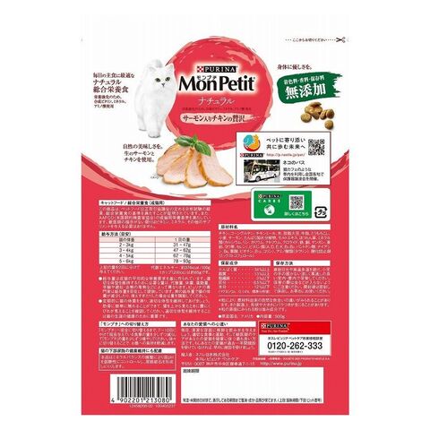 チキン、コーングルテン、チキンミール、米、脱脂大豆、牛脂、とうもろこし、小麦、サーモン、たんぱく加水分解物、モルトエキス、ほうれん草、ミネラル類(カルシウム、リン、カリウム、ナトリウム、クロライド、鉄、銅、マンガン、亜鉛、ヨウ素、セレン)、ビタミン類(A、D、E、K、B1、B2、パントテン酸、ナイアシン、B6、葉酸、ビオチン、B12、コリン)、アミノ酸類(タウリン)、酸化防止剤(ミックストコフェロール)