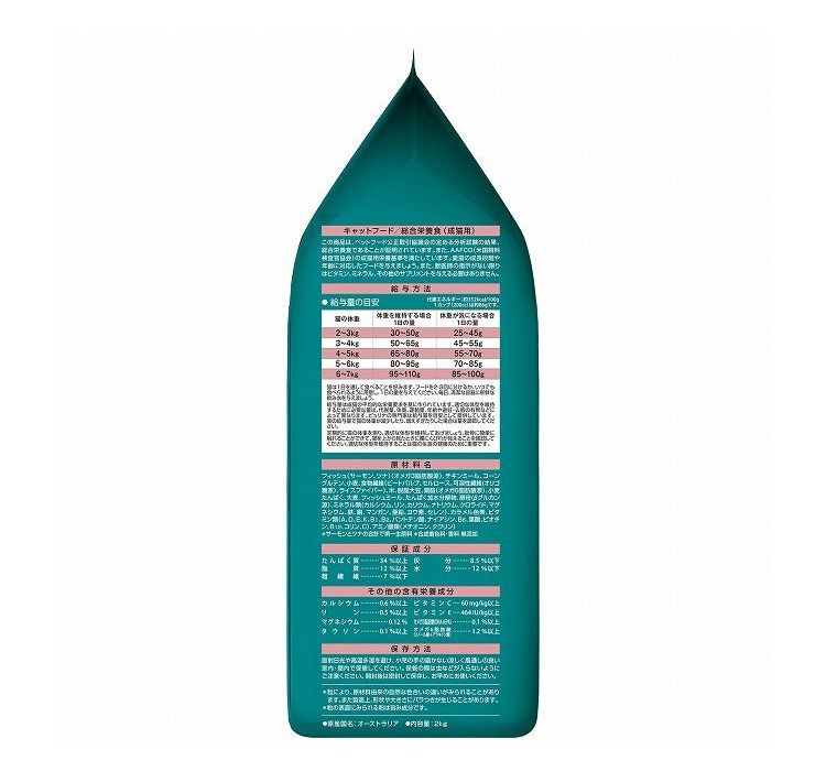 フィッシュ(サーモン、ツナ)(オメガ3脂肪酸源)、チキンミール、コーングルテン、小麦、米、脱脂大豆、食物繊維(ビートパルプ、ライスファイバー、セルロース)、鶏脂(オメガ6脂肪酸源)、チコリ(オリゴ糖源)、小麦たんぱく、たんぱく加水分解物、大麦、酵母(βグルカン源)、ミネラル類(カルシウム、リン、カリウム、ナトリウム、クロライド、マグネシウム、鉄、銅、マンガン、亜鉛、ヨウ素、セレン)、ビタミン類(A、D、E、K、B1、B2、パントテン酸、ナイアシン、B6、葉酸、ビオチン、B12、コリン、C)、カラメル色素、アミノ酸類(メチオニン、タウリン)、酸化防止剤(ミックストコフェロール)