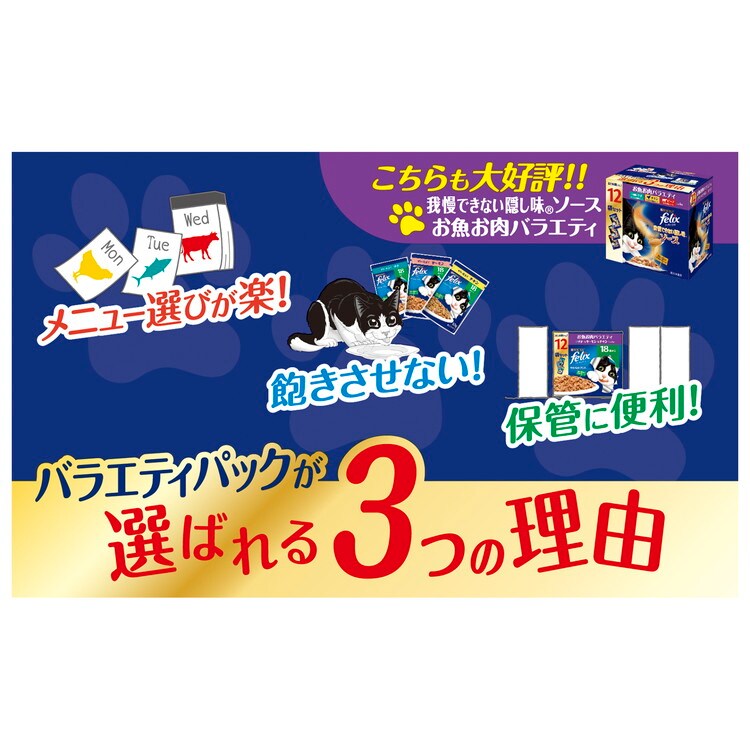 ・18歳からのネコさんが食べやすい小さめフレークで、ツナ・サーモン・チキンの3種類が入ったバラエティパック。