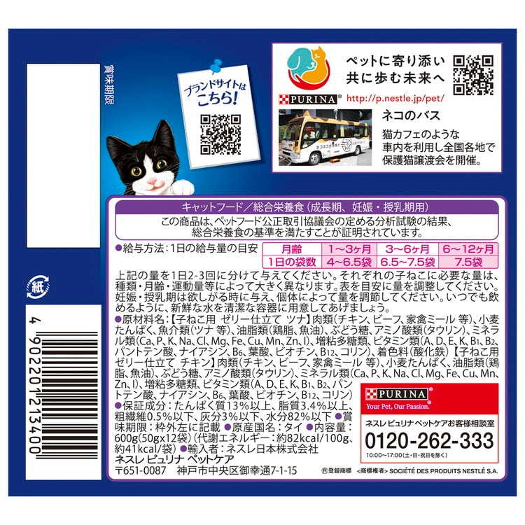 ・1歳までの子ねこが食べやすい小さめフレークで、ツナ・チキンの2種類が入ったバラエティパック。