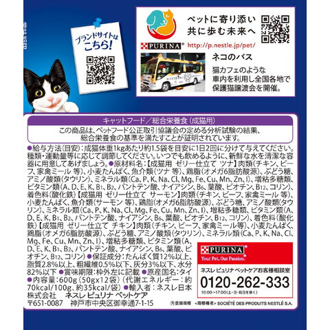 肉類(チキン、ビーフ、家禽ミール 等)、小麦たんぱく、魚介類(ツナ 等)、鶏脂(オメガ6脂肪酸源)、ぶどう糖、アミノ酸類(タウリン)、ミネラル類(Ca、P、K、Na、Cl、Mg、Fe、Cu、Mn、Zn、I)、増粘多糖類、ビタミン類(A、D、E、K、B1、B2、パントテン酸、ナイアシン、B6、葉酸、ビオチン、B12、コリン)、着色料(酸化鉄)