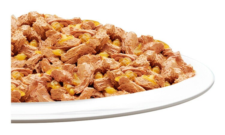肉類(チキン、ビーフ、家禽ミール 等)、小麦たんぱく、魚介類(ツナ(DHA源) 等)、鶏脂、ぶどう糖、アミノ酸類(タウリン)、ミネラル類(Ca、P、K、Na、Cl、Mg、Fe、Cu、Mn、Zn、I)、増粘多糖類、ビタミン類(A、D、E、K、B1、B2、パントテン酸、ナイアシン、B6、葉酸、ビオチン、B12、コリン)、着色料(酸化鉄)
