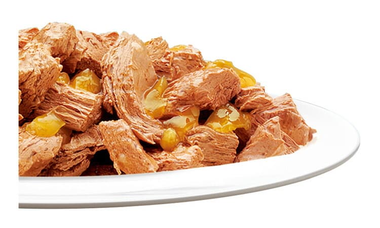 肉類(チキン、ビーフ、家禽ミール 等)、小麦たんぱく、魚介類(サーモン 等)、鶏脂(オメガ6脂肪酸源)、ぶどう糖、アミノ酸類(タウリン)、ミネラル類(Ca、P、K、Na、Cl、Mg、Fe、Cu、Mn、Zn、I)、増粘多糖類、ビタミン類(A、D、E、K、B1、B2、パントテン酸、ナイアシン、B6、葉酸、ビオチン、B12、コリン)、着色料(酸化鉄)