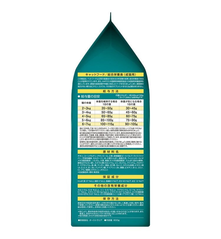 チキン、コーングルテン、チキンミール、小麦、食物繊維(ビートパルプ、ライスファイバー、可溶性繊維、セルロース)、米、小麦たんぱく、脱脂大豆、フィッシュミール(オメガ3脂肪酸源)、ソルガム、大麦、鶏脂(オメガ6脂肪酸源)、たんぱく加水分解物、酵母(βグルカン源)、ミネラル類(カルシウム、リン、カリウム、ナトリウム、クロライド、マグネシウム、鉄、銅、マンガン、亜鉛、ヨウ素、セレン)、カラメル色素、ビタミン類(A、D、E、K、B1、B2、パントテン酸、ナイアシン、B6、葉酸、ビオチン、B12、コリン、C)、アミノ酸類(メチオニン、タウリン)