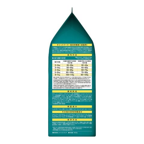 チキン、コーングルテン、チキンミール、小麦、食物繊維(ビートパルプ、ライスファイバー、可溶性繊維、セルロース)、米、小麦たんぱく、脱脂大豆、フィッシュミール(オメガ3脂肪酸源)、ソルガム、大麦、鶏脂(オメガ6脂肪酸源)、たんぱく加水分解物、酵母(βグルカン源)、ミネラル類(カルシウム、リン、カリウム、ナトリウム、クロライド、マグネシウム、鉄、銅、マンガン、亜鉛、ヨウ素、セレン)、カラメル色素、ビタミン類(A、D、E、K、B1、B2、パントテン酸、ナイアシン、B6、葉酸、ビオチン、B12、コリン、C)、アミノ酸類(メチオニン、タウリン)