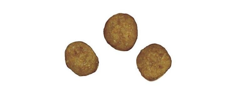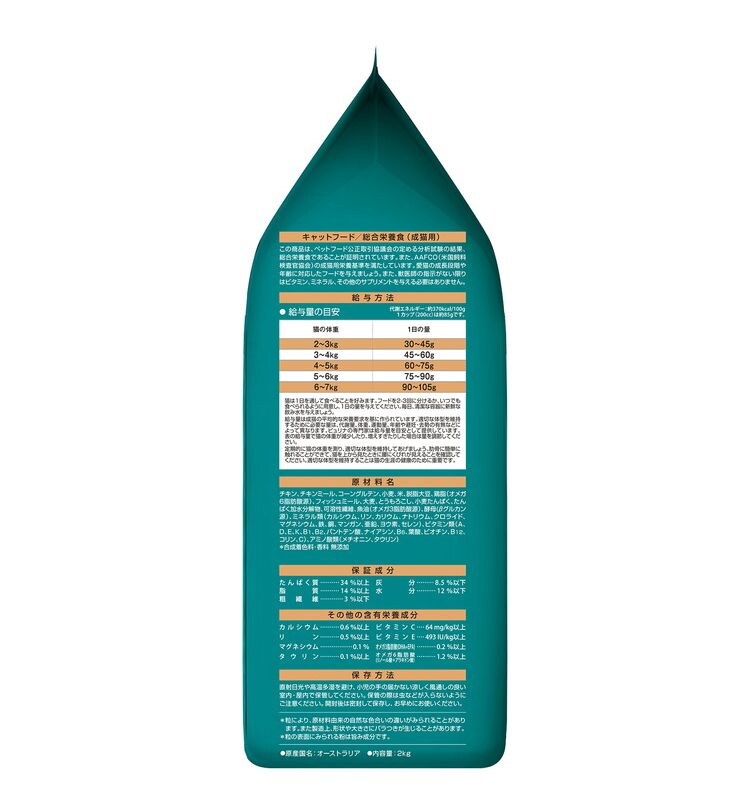 たんぱく質34%以上、脂質14%以上、粗繊維3%以下、灰分8.5%以下、水分12%以下