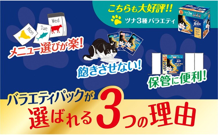 ・お魚大好きネコさんにツナ・サーモン・あじの3種類が入ったバラエティパック。