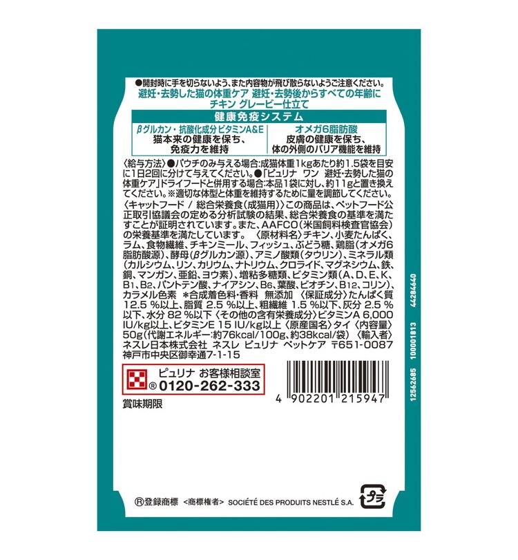 【24個セット】 ネスレ ピュリナワンキャット パウチ 避妊去勢した猫の体重ケア チキングレービー仕立て 50g【ポイント10倍】 【送料無料】