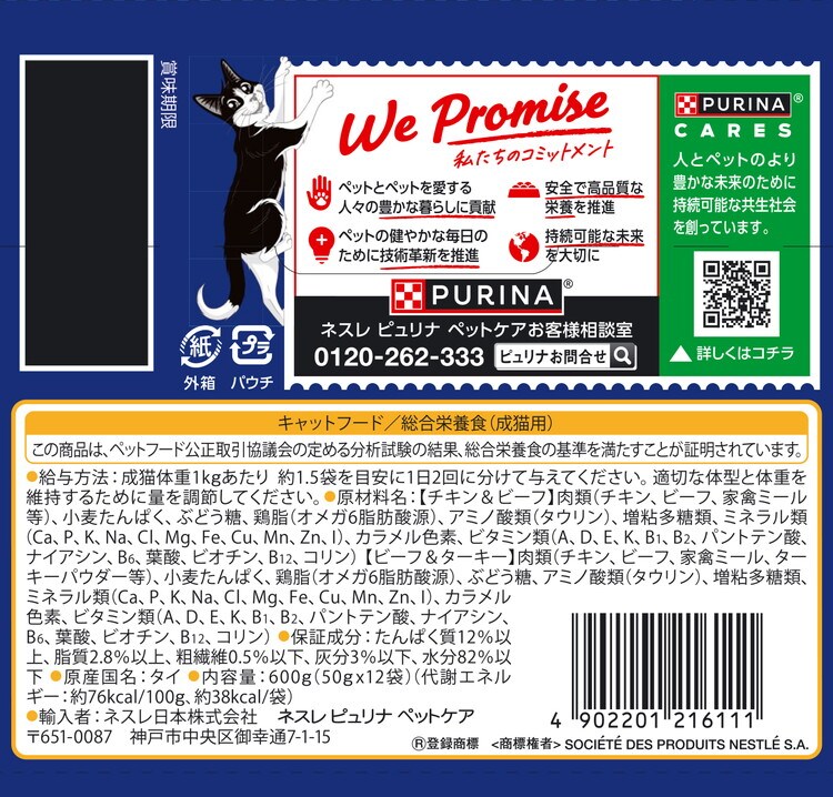 肉類(チキン、ビーフ、家禽ミール等)、小麦たんぱく、ぶどう糖、鶏脂(オメガ6脂肪酸源)、アミノ酸類(タウリン)、増粘多糖類、ミネラル類(Ca、P、K、Na、Cl、Mg、Fe、Cu、Mn、Zn、I)、カラメル色素、ビタミン類(A、D、E、K、B1、B2、パントテン酸、ナイアシン、B6、葉酸、ビオチン、B12、コリン)