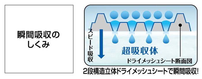 ・2段構造立体ドライメッシュシートが、オシッコの逆戻りによる足ヌレを解消、フチモレもせず。シートの表面はいつもサラサラ。
