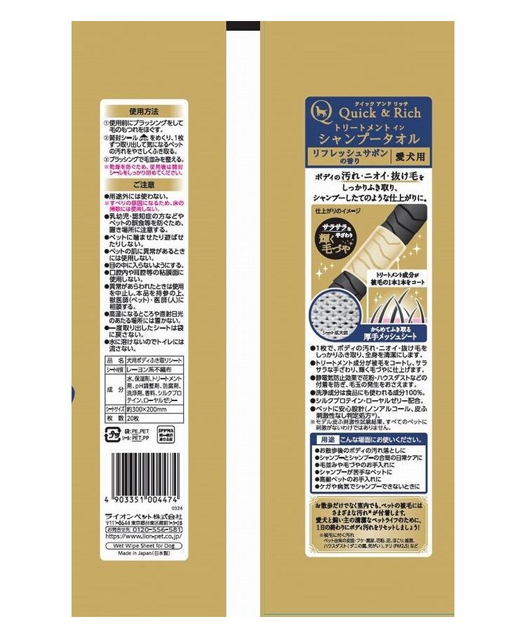 ライオンペット Quick&Rich トリートメントインシャンプータオル 愛犬用 リフレッシュサボン 20枚【ポイント10倍】