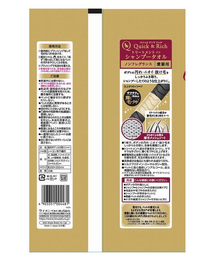 ライオンペット Quick&Rich トリートメントインシャンプータオル 愛猫用 20枚【ポイント10倍】