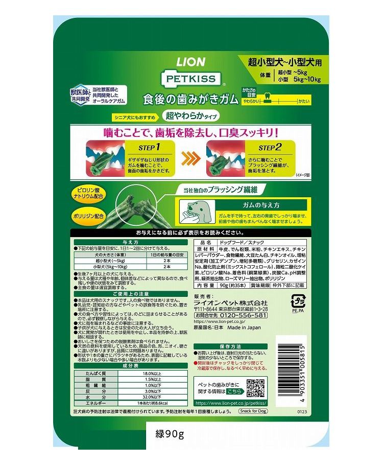 ライオンペット PETKISS 食後の歯みがきガム 超やわらかタイプ 超小型犬~小型犬用 90g【ポイント10倍】