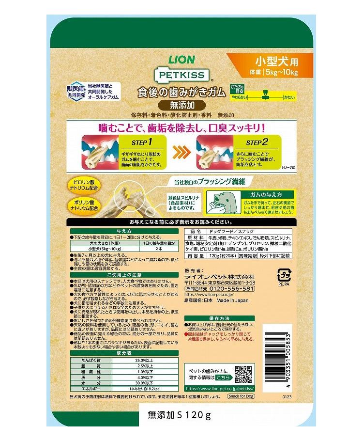 ライオンペット PETKISS 食後の歯みがきガム 無添加 小型犬用 120g【ポイント10倍】