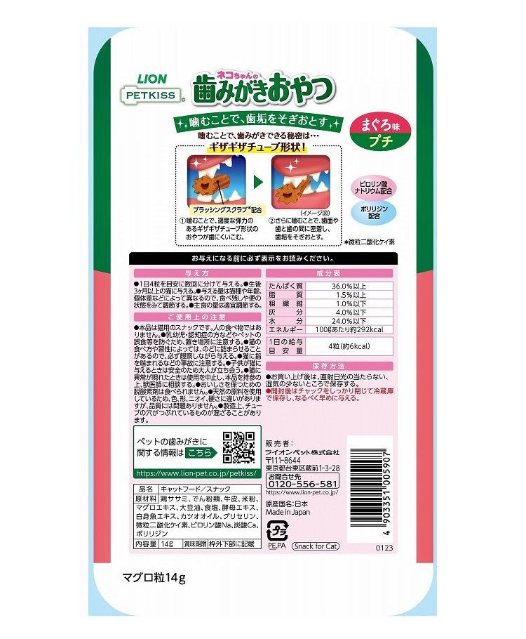 ライオンペット PETKISS ネコちゃんの歯みがきおやつ まぐろ味 プチ 14g【ポイント10倍】