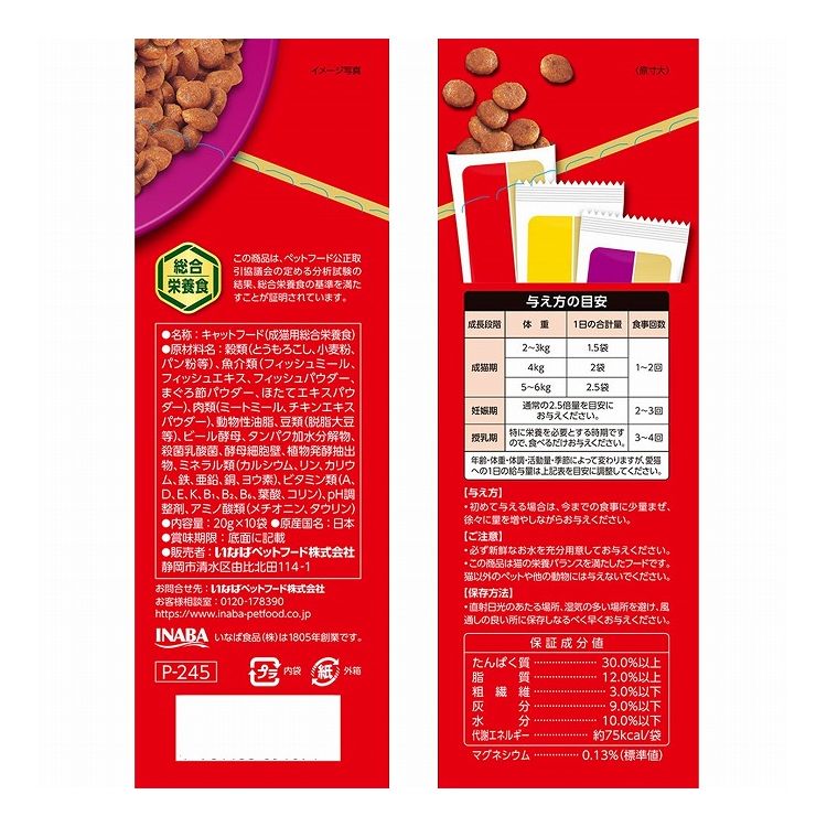 穀類(とうもろこし、小麦粉、パン粉等)、魚介類(フィッシュミール、フィッシュエキス、フィッシュパウダー、まぐろ節パウダー、ほたてエキスパウダー)、ミートミール、動物性油脂、豆類(脱脂大豆等)、ビール酵母、タンパク加水分解物、殺菌乳酸菌、チキンエキスパウダー、酵母細胞壁、植物発酵抽出物、ミネラル類(カルシウム、リン、カリウム、鉄、亜鉛、銅、ヨウ素)、ビタミン類(A、D、E、K、B1、B2、B6、葉酸、コリン)、アミノ酸類(メチオニン、タウリン)、pH調整剤