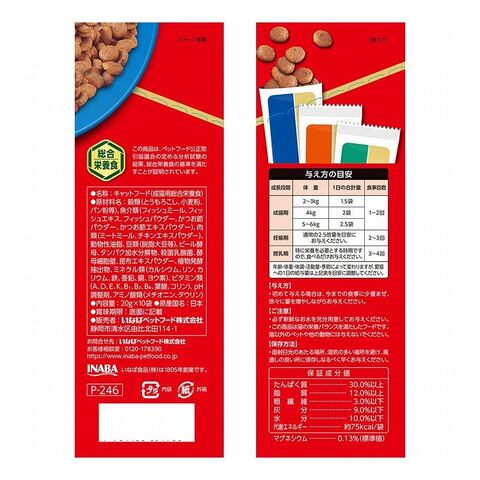 穀類(とうもろこし、小麦粉、パン粉等)、魚介類(フィッシュミール、フィッシュエキス、フィッシュパウダー、かつお節パウダー、かつお節エキスパウダー)、ミートミール、動物性油脂、豆類(脱脂大豆等)、ビール酵母、タンパク加水分解物、殺菌乳酸菌、チキンエキスパウダー、酵母細胞壁、昆布エキスパウダー、植物発酵抽出物、ミネラル類(カルシウム、リン、カリウム、鉄、亜鉛、銅、ヨウ素)、ビタミン類(A、D、E、K、B1、B2、B6、葉酸、コリン)、アミノ酸類(メチオニン、タウリン)、pH調整剤