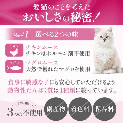 厳選した原材料とこだわりの製法で高い嗜好性を持つ子猫用総合栄養食ムース。成長期の子猫に必要な栄養を提供します。動物性たんぱく質はホルモン剤不使用のチキンのみを使用、グルテンフリーでグルテン等にアレルギーのある子に配慮しています。自然の栄養価を保つためスチーム製法を採用。食品の鮮度を維持するために、全ての原材料は調理開始から2時間以内に製品化されます。香料、着色料、保存料不使用。