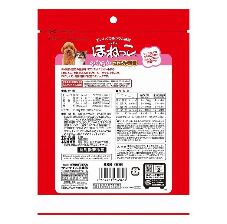 骨・関節・筋肉の健康をバランスよくサポートする「ほねっこ」を旨みあふれるジューシーササミで包んだ、おいしくて健康維持に役立つスナックです。