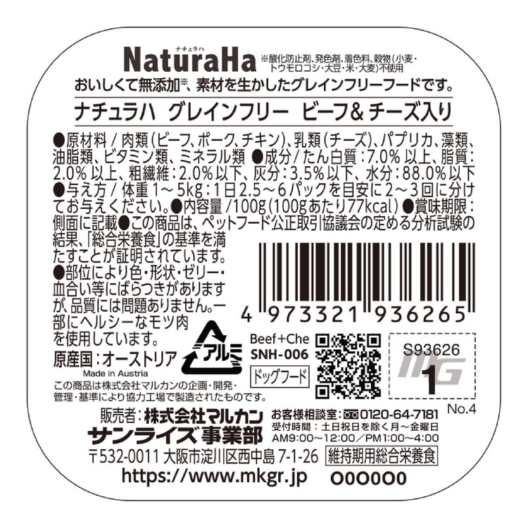 【36個セット】 マルカン サンライズ ナチュラハ グレインフリー ビーフ&チーズ入り100g【ポイント10倍】 【送料無料】